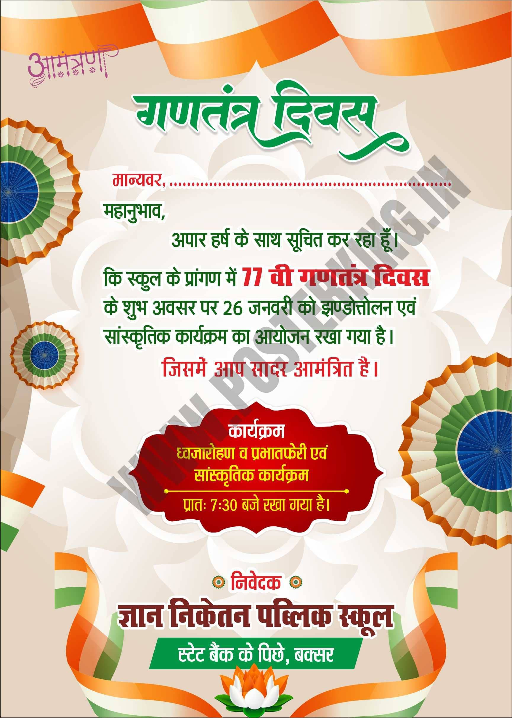 • कंटेंट: कार्ड में ध्वजारोहण, प्रभातफेरी और सांस्कृतिक कार्यक्रमों की जानकारी स्पष्ट रूप से लिखी गई है।