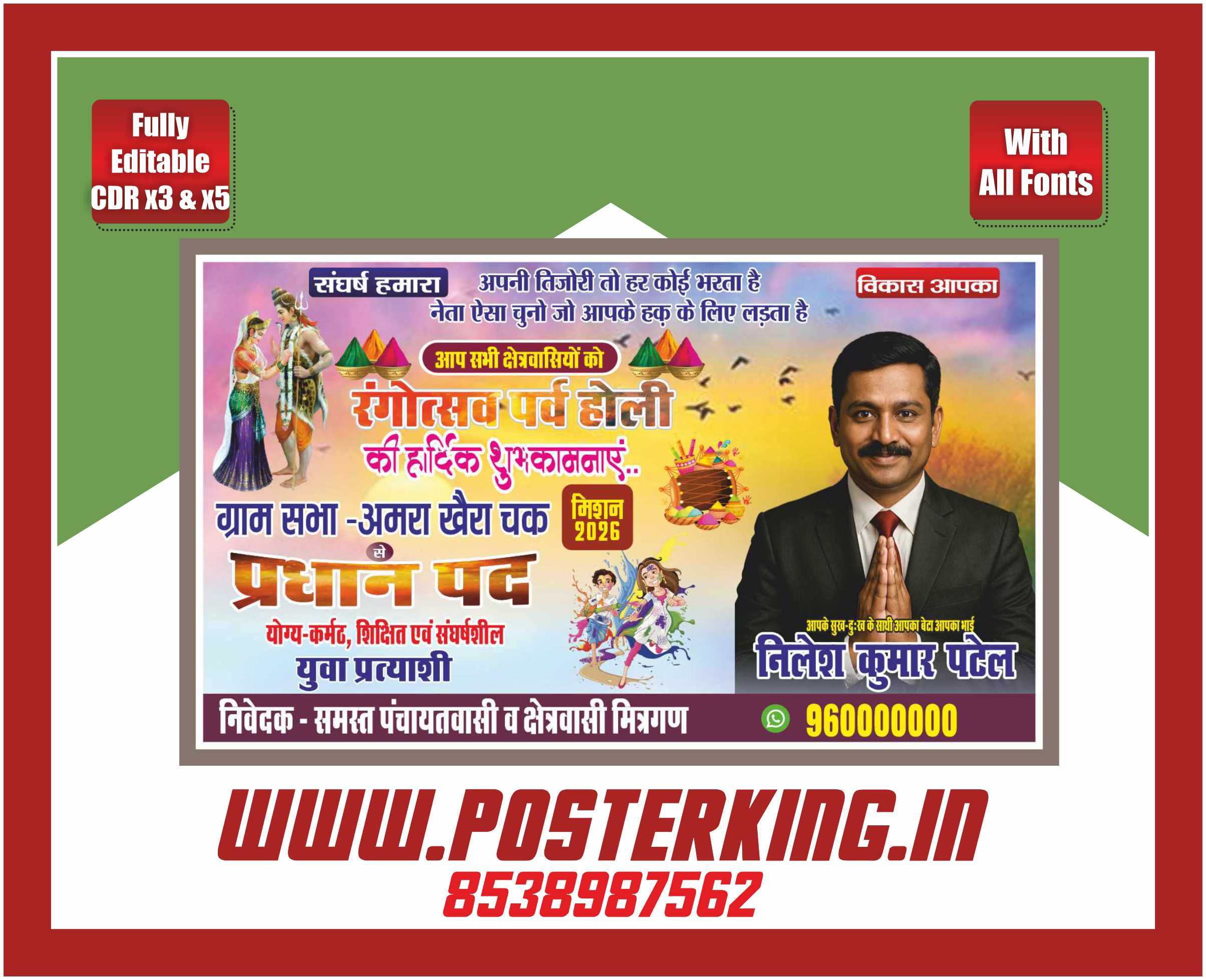 चुनावी और सांस्कृतिक तालमेल: इसमें “रंगोत्सव पर्व होली” की बधाई के साथ ‘प्रधान पद’ के प्रत्याशी का विवरण बहुत ही प्रभावशाली ढंग से दिया गया है। पोस्टर में राधा-कृष्ण की होली खेलते हुए तस्वीर और पिचकारी-गुलाल के ग्राफिक्स का उपयोग किया गया है।