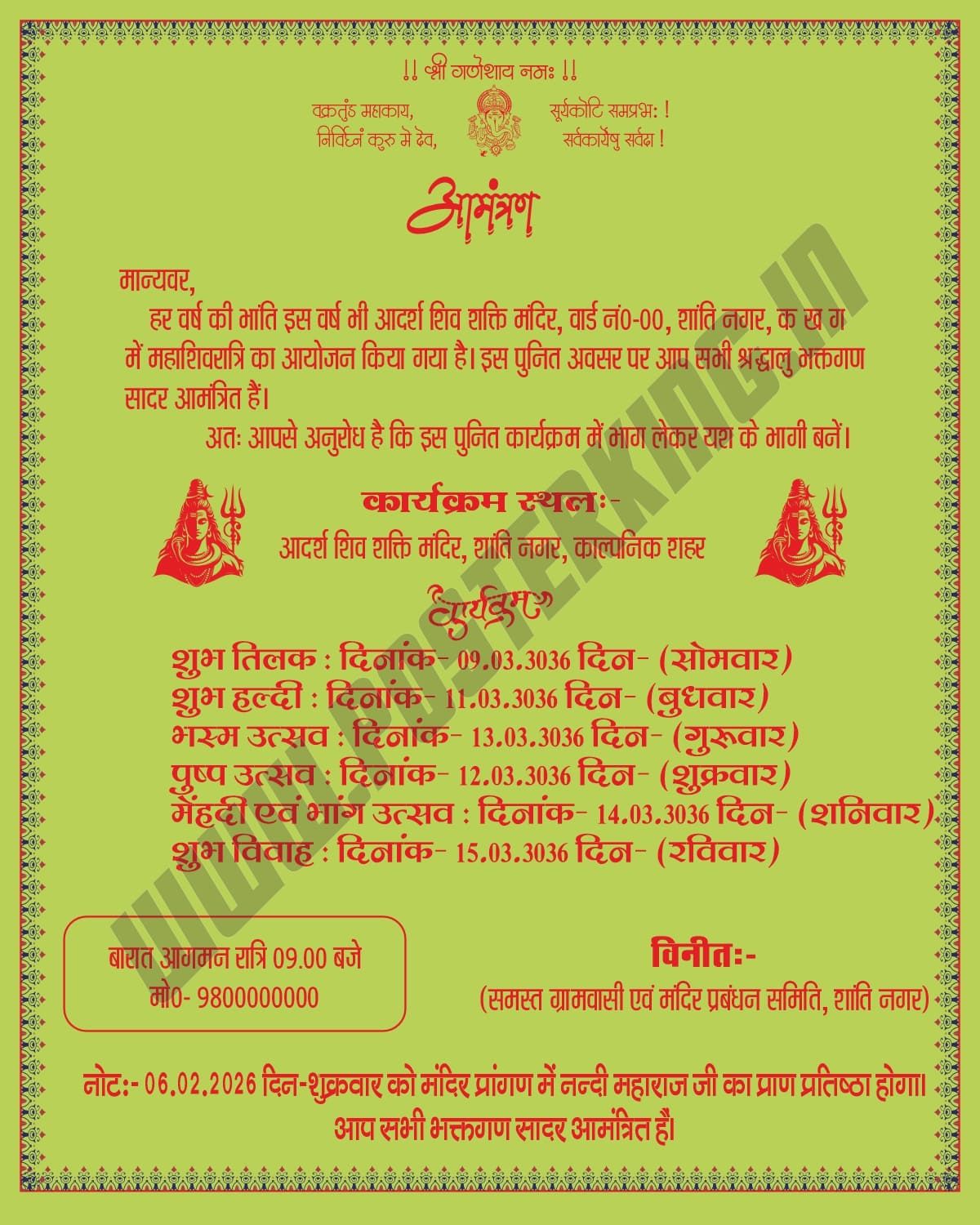 यह डिजिटल फाइल विशेष रूप से महाशिवरात्रि महोत्सव और मंदिर प्राण प्रतिष्ठा जैसे धार्मिक आयोजनों के लिए तैयार की गई है। इस कार्ड का डिज़ाइन पूरी तरह से हिंदू धर्म की आस्था और परंपराओं को समर्पित है।