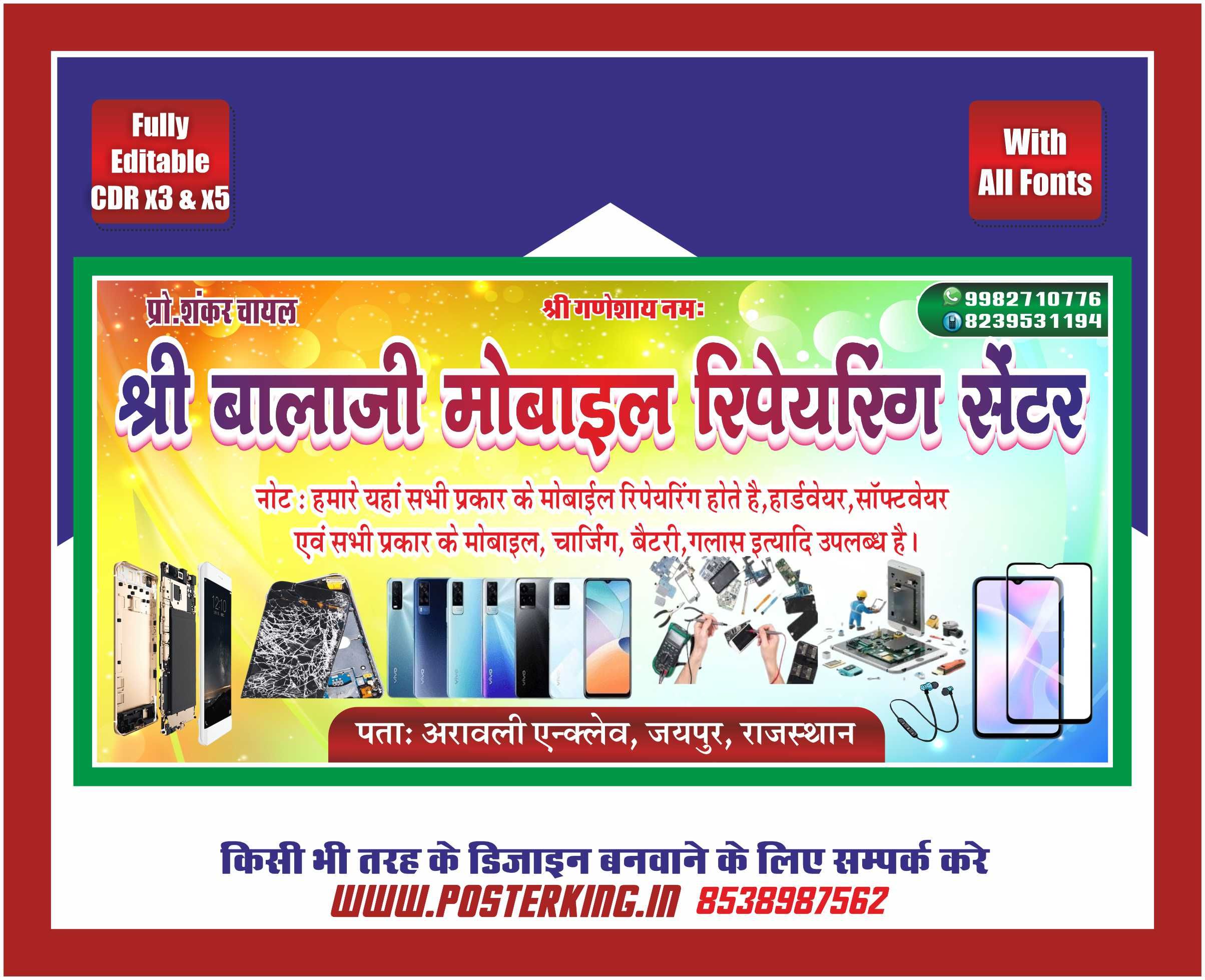 प्रोफेशनल हेडर: मुख्य शीर्षक “श्री बालाजी मोबाइल रिपेयरिंग सेंटर” को 3D इफ़ेक्ट और साफ़ फॉन्ट्स में सजाया गया है।