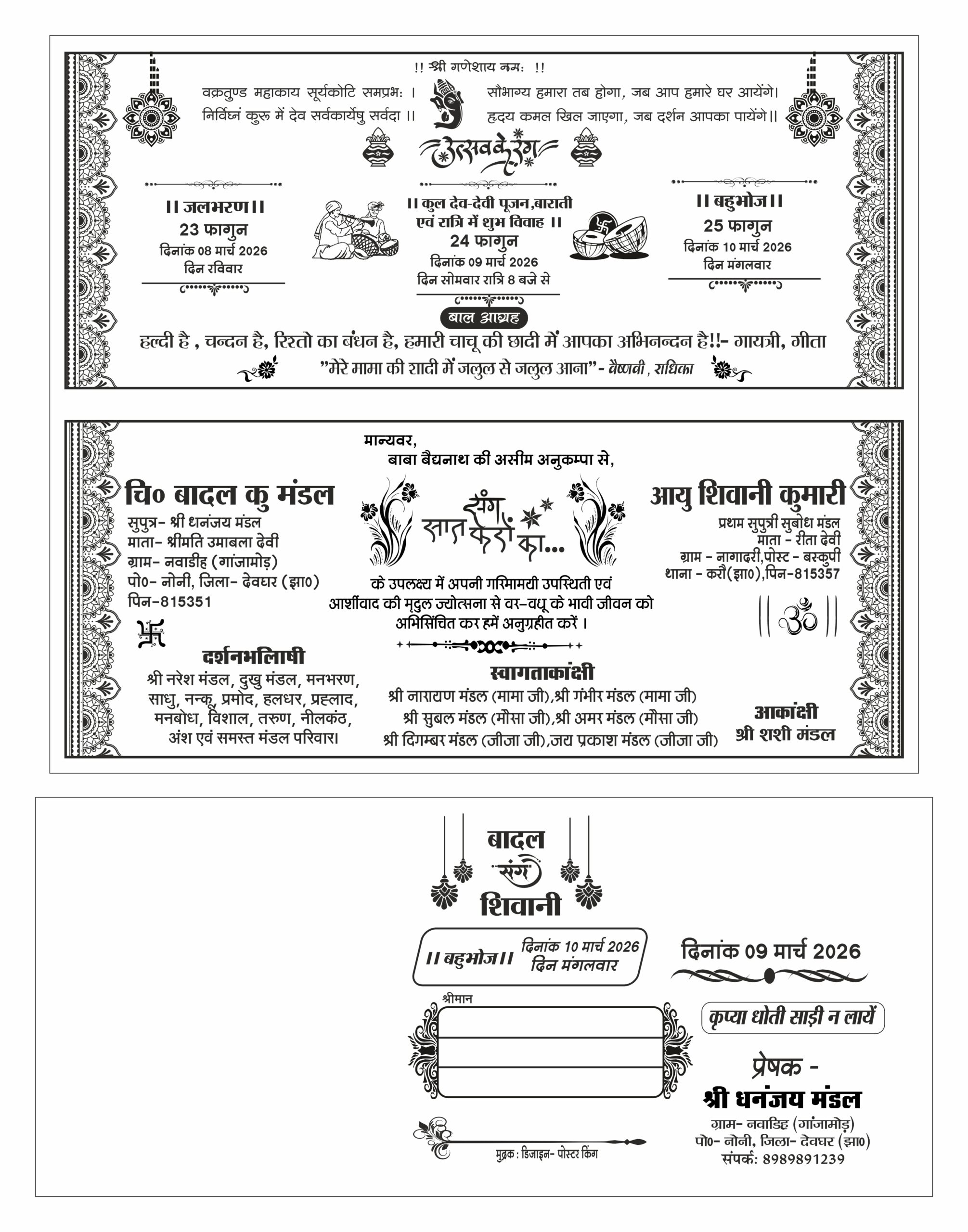 यह एक उच्च गुणवत्ता वाली CorelDraw (CDR) फाइल है, जिसे भारतीय विवाह परंपराओं के अनुसार बहुत ही बारीकी से डिजाइन किया गया है। इस डिजाइन में “बादल और शिवानी” के विवाह उत्सव के सभी महत्वपूर्ण भागों को शामिल किया गया है, जैसे कि जलभरण, शुभ विवाह और बहुभोज। कार्ड के लेआउट में आकर्षक बॉर्डर, धार्मिक श्लोक और पारंपरिक क्लिपआर्ट का बेहतरीन उपयोग किया गया है।