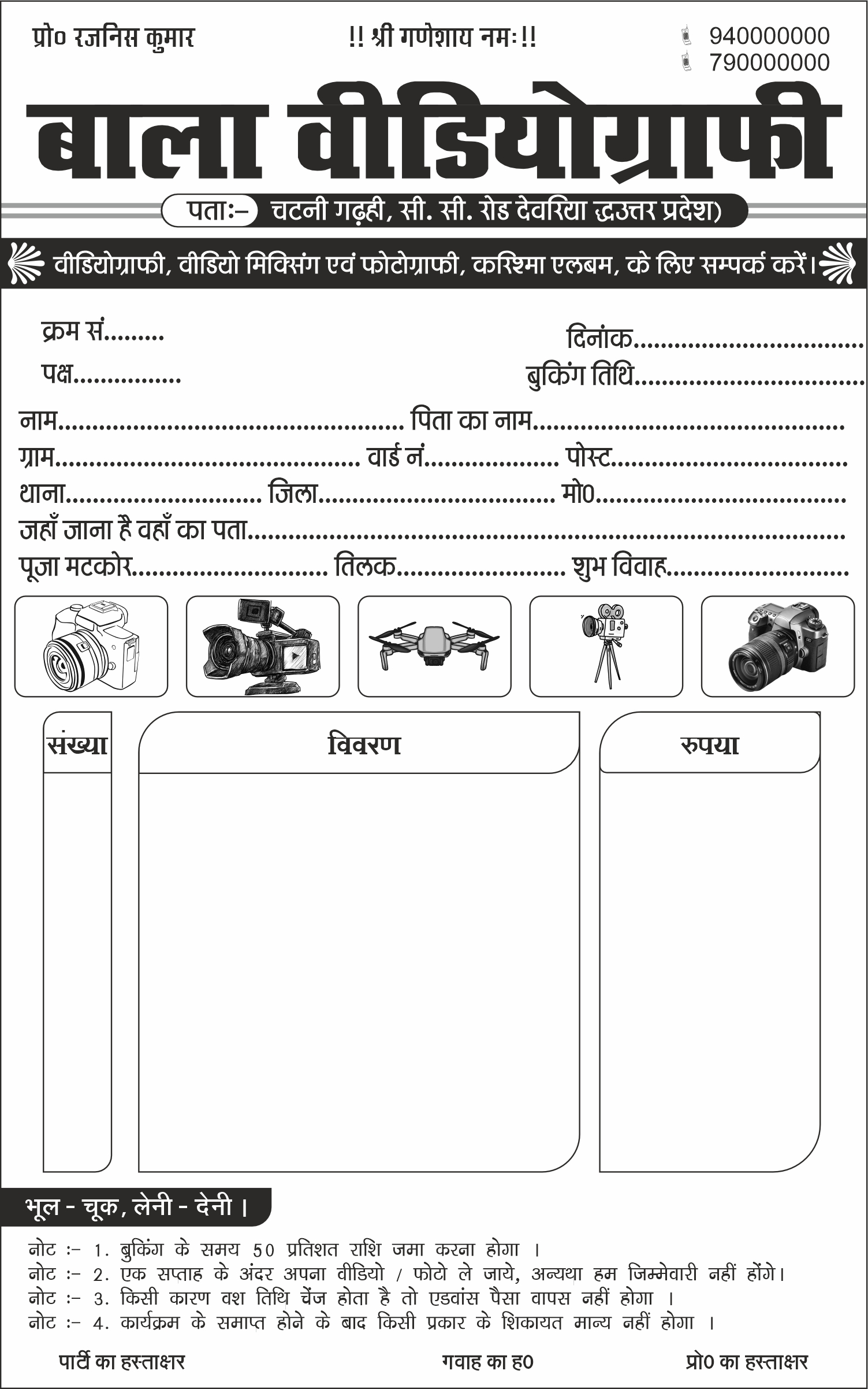 डिजाइन की मुख्य विशेषताएं: इस बिल बुक के ऊपरी हिस्से में “बाला वीडियोग्राफी” का आकर्षक बोल्ड फोंट इस्तेमाल किया गया है। इसमें प्रोपराइटर का नाम, मोबाइल नंबर और पते के लिए स्पष्ट जगह दी गई है। धार्मिक आस्था को ध्यान में रखते हुए “!! श्री गणेशाय नमः !!” का उल्लेख है। डिजाइन के बीच में हाई-क्वालिटी कैमरा और ड्रोन के वेक्टर इमेजेज लगाए गए हैं, जो इसे एक आधुनिक और प्रोफेशनल लुक देते हैं।