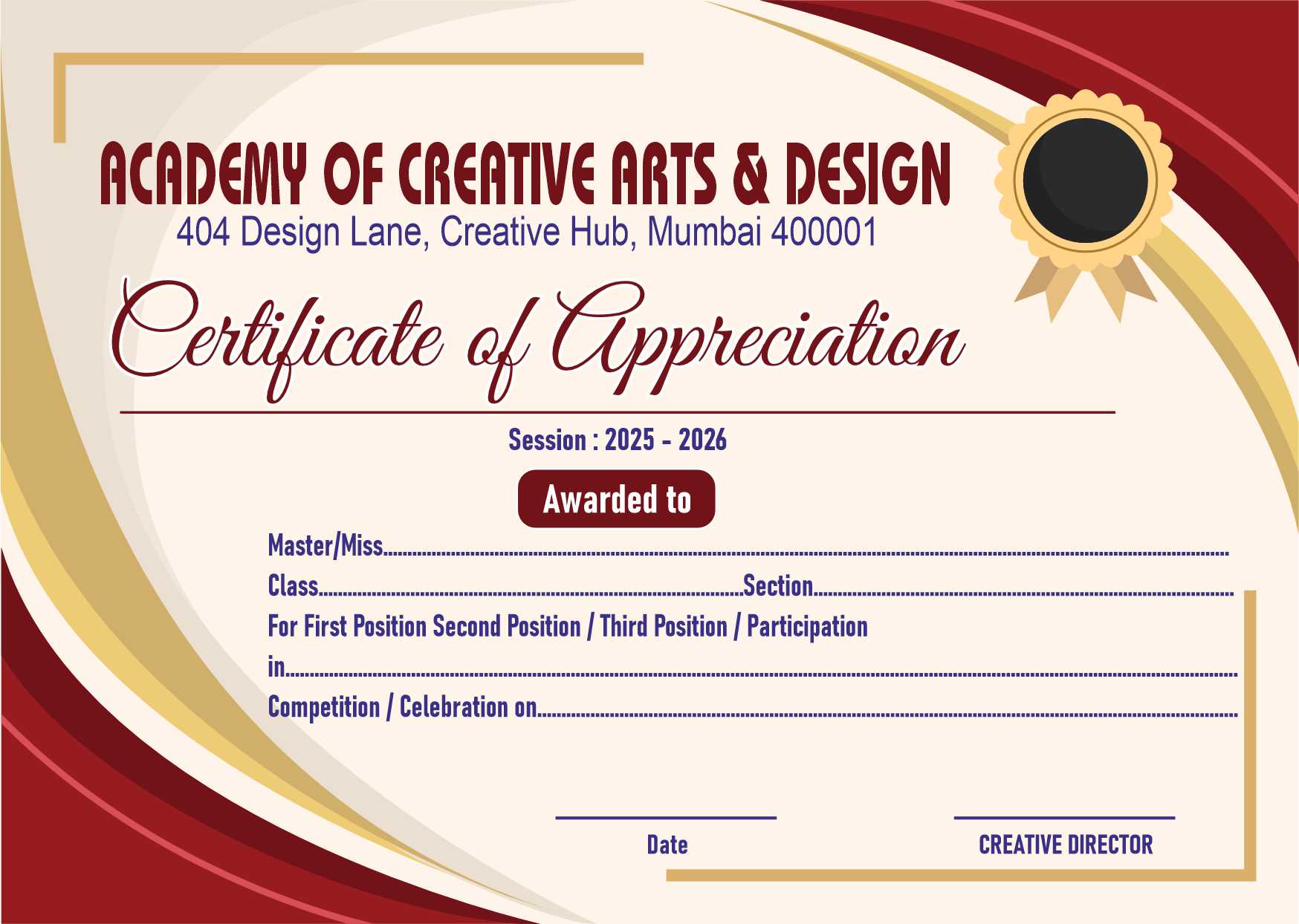 इस सर्टिफिकेट में हमने Modern Maroon और Elegant Golden कलर थीम का इस्तेमाल किया है, जो किसी भी प्रोग्राम को एक रॉयल और फॉर्मल टच देता है। चाहे वह किसी स्कूल की प्रतियोगिता हो, स्पोर्ट्स इवेंट हो या किसी प्रोफेशनल ट्रेनिंग एकेडमी का वार्षिक उत्सव, यह डिजाइन हर जगह अपनी छाप छोड़ेगा।