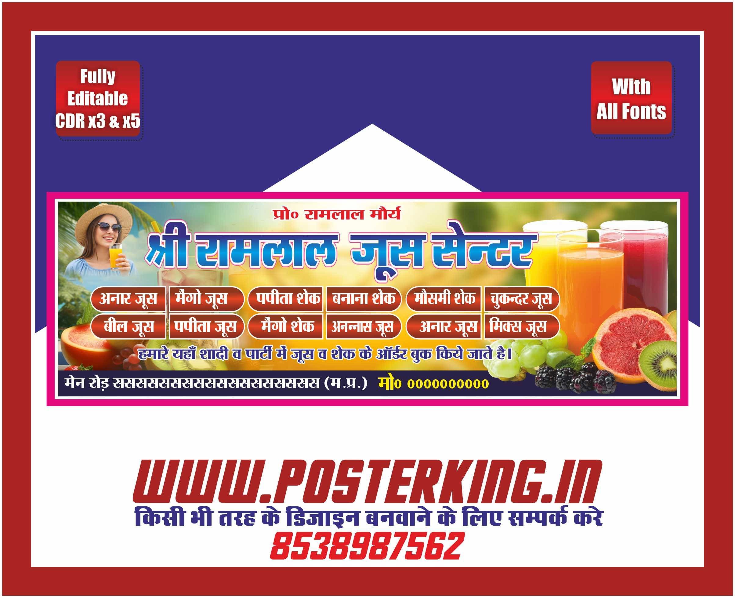 यह डिजिटल फाइल विशेष रूप से जूस और शेक पार्लर के व्यवसाय के लिए तैयार की गई है। इस बैनर का मुख्य उद्देश्य ग्राहकों को उपलब्ध विभिन्न प्रकार के जूस और शेक की जानकारी एक ही नज़र में देना है। डिज़ाइन में ताजगी और स्वाद का बेहतरीन तालमेल बिठाया गया है।