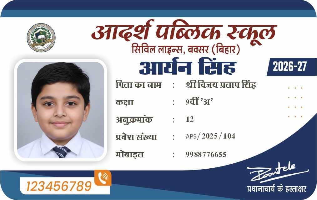 व्यावसायिक लेआउट: कार्ड के शीर्ष पर स्कूल का नाम (जैसे: आदर्श पब्लिक स्कूल, बक्सर) और लोगो के लिए समर्पित स्थान दिया गया है।