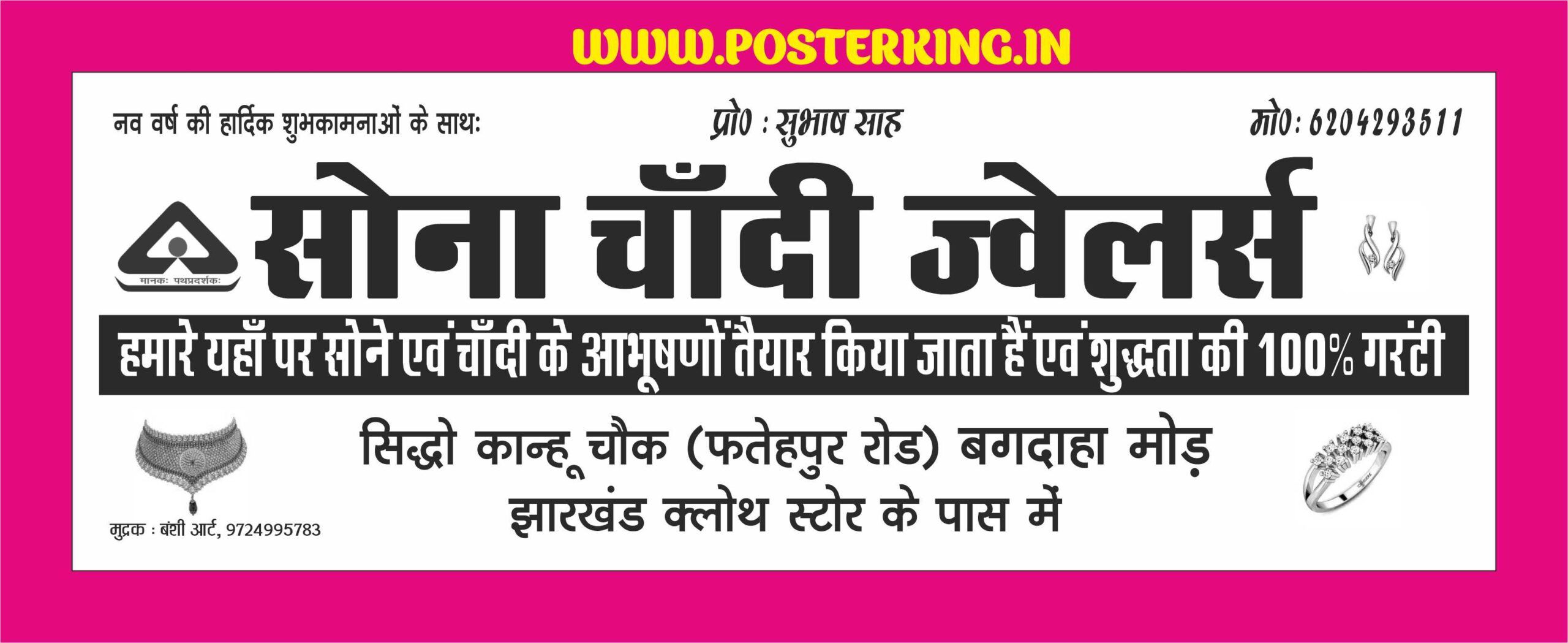 डिजाइन में “सोना चाँदी ज्वेलर्स” को मुख्य केंद्र बिंदु बनाया गया है। इसमें दुकान के मालिक का नाम (प्रो. सुभाष साह) और मोबाइल नंबर के लिए समर्पित स्थान दिया गया है। एड्रेस सेक्शन (सिद्धो कान्हू चौक, बगदाहा मोड़) को बहुत ही स्पष्टता के साथ नीचे की तरफ सेट किया गया है ताकि ग्राहकों को स्थान समझने में आसानी हो। इसमें शुद्धता के भरोसे को दर्शाने के लिए “100% गारंटी” का टेक्स्ट बॉक्स भी शामिल है, जो ग्राहक का विश्वास जीतने में मदद करता है।
