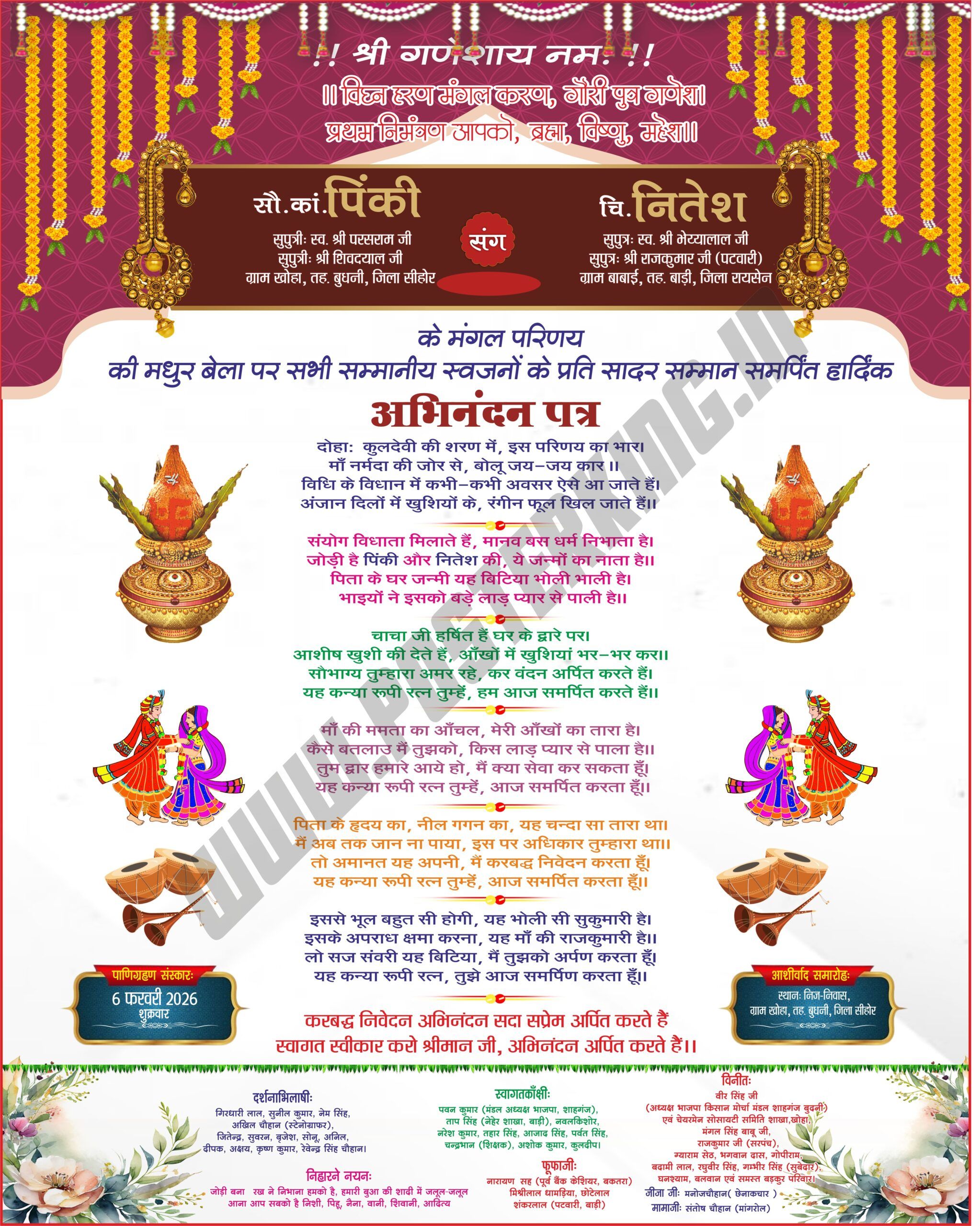 यह डिजिटल फाइल एक उच्च गुणवत्ता वाला विवाह अभिनंदन पत्र (Abhinandan Patra) डिज़ाइन है, जिसे विशेष रूप से मांगलिक कार्यों के लिए तैयार किया गया है। इस कार्ड का लेआउट पारंपरिक भारतीय संस्कृति और आधुनिक ग्राफिक डिज़ाइन का एक सुंदर मिश्रण है।